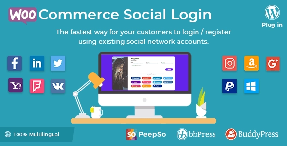 Social Login permite que tus clientes puedan iniciar sesión mediante sus cuentas de Facebook, Twitter, Google, Amazon, LinkedIn, PayPal, Instagram, Disqus, Yahoo o VK. De esta manera, se acelera el proceso de pago y se mejora la conversión de ventas. Además, los nuevos clientes pueden hacer su compra fácilmente, usando sus cuentas de redes sociales y omitiendo el engorroso proceso de registro.